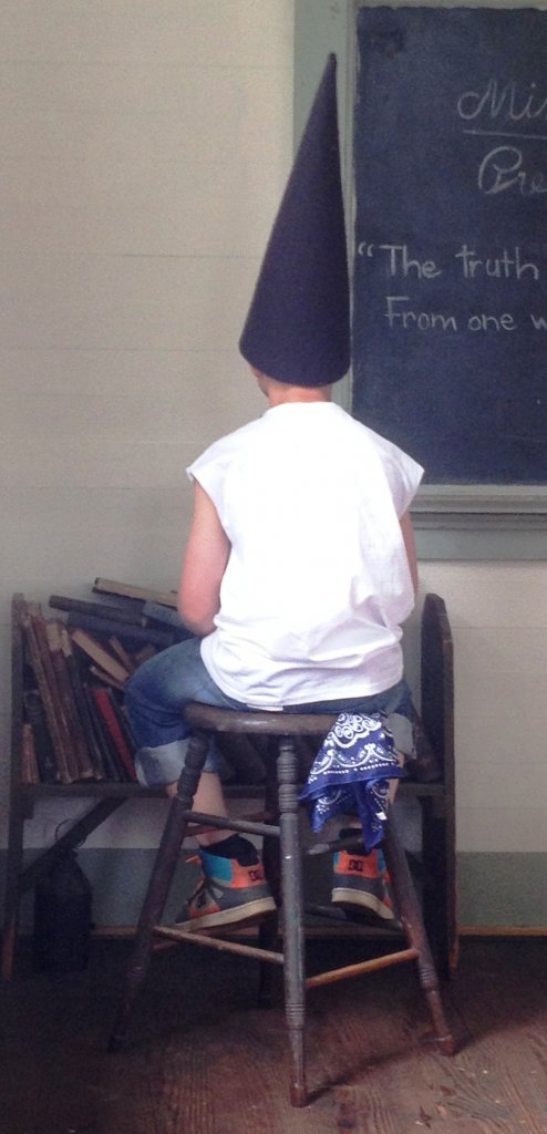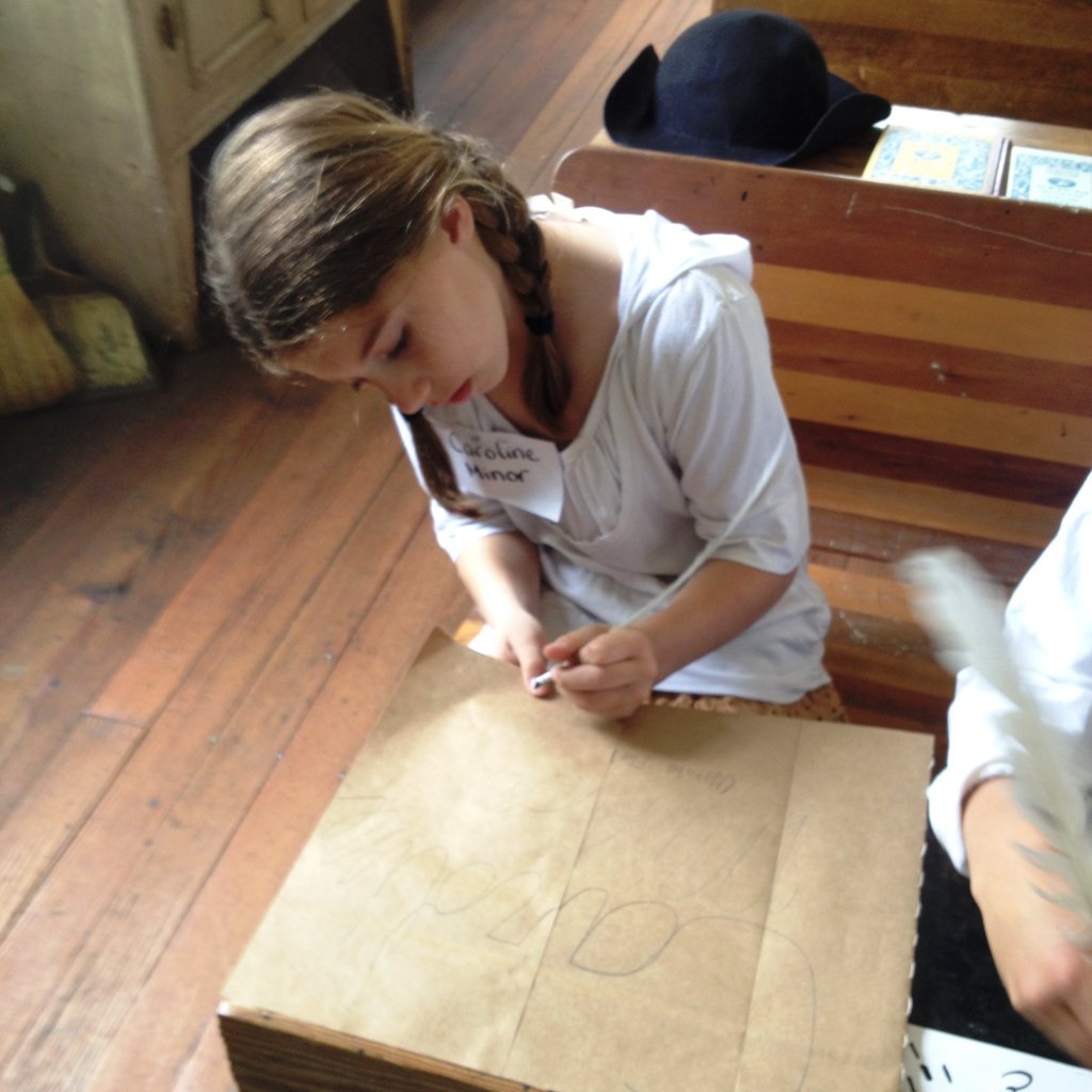 Weeks before the trip students are given an identity from a student who was in the school in 1880. They have to learn about the child’s family and for the second time one of our daughters had Caroline Minor. She was a first grader and one of three in her family who attended the school. She was very proud of the fact that her father helped build the school. The students go through a typical 2 hour day of instruction on moral lessons, arithmetic, writing, geography, reading and spelling, and grammar and composition. One student is chosen to act up so he can be put in the dunce chair, and were even taught about a ferule (that’s the stick the teacher would crack their hands with when necessary). Once the work is completed they are allowed a short recess, then lunch with period specific food they have brought with them (corn bread, apples, hard boiled eggs, bacon, sugar cookies).